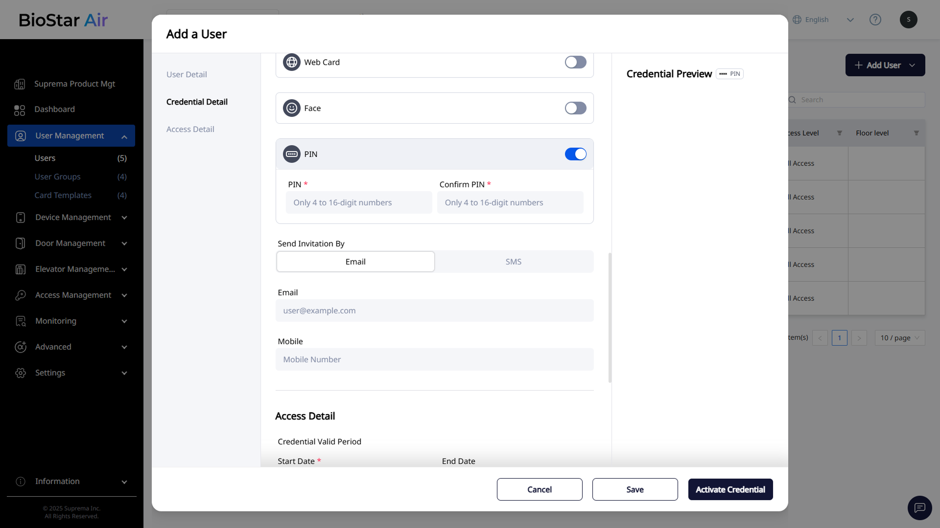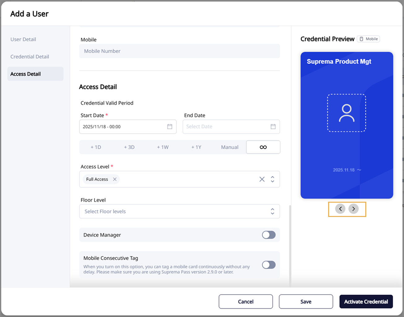 After selecting credentials, configure the credential validity period, access levels, and floor levels in the Access Detail section.