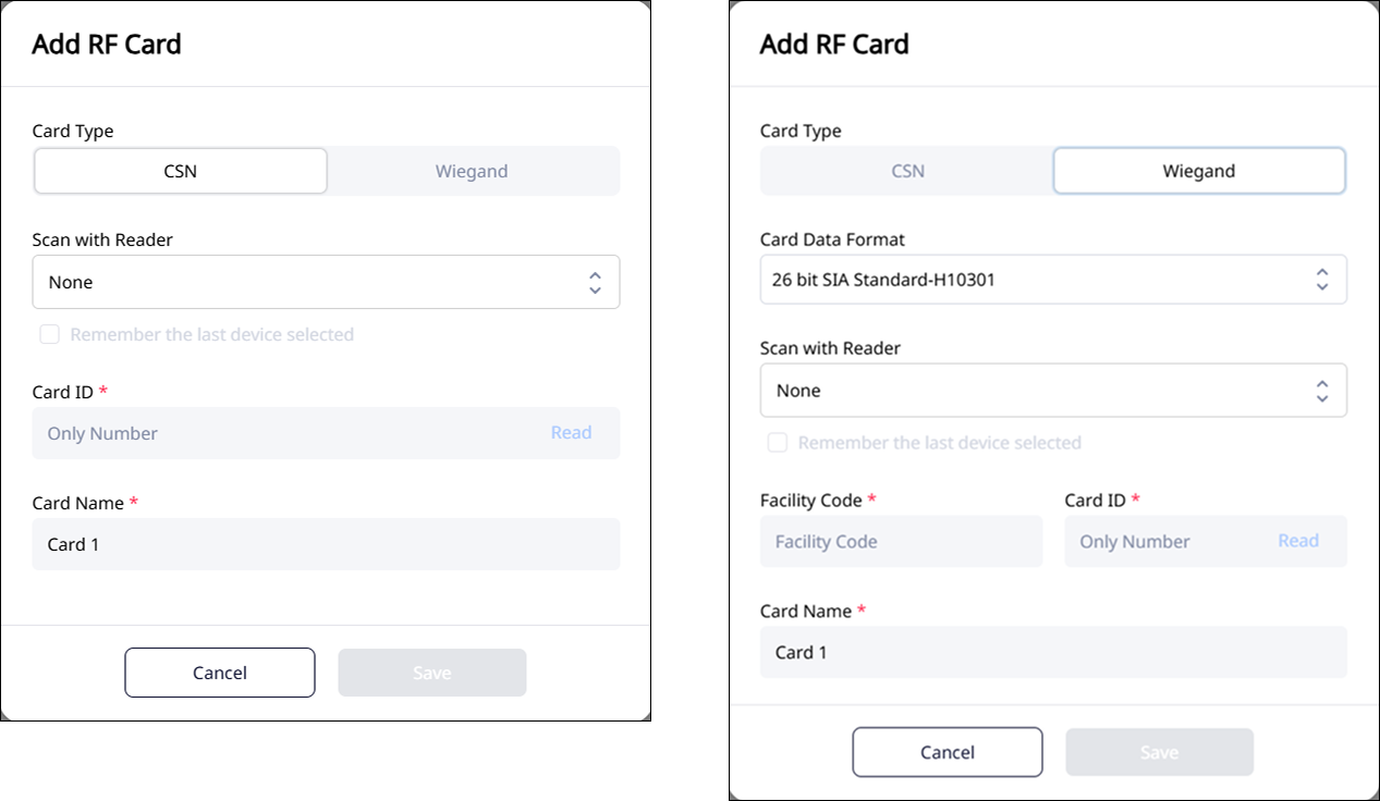 Configure the card type (CSN or Wiegand), card ID, and card name. Select a reader in Scan with Reader. Alternatively, scan a physical RFID card with the connected reader.