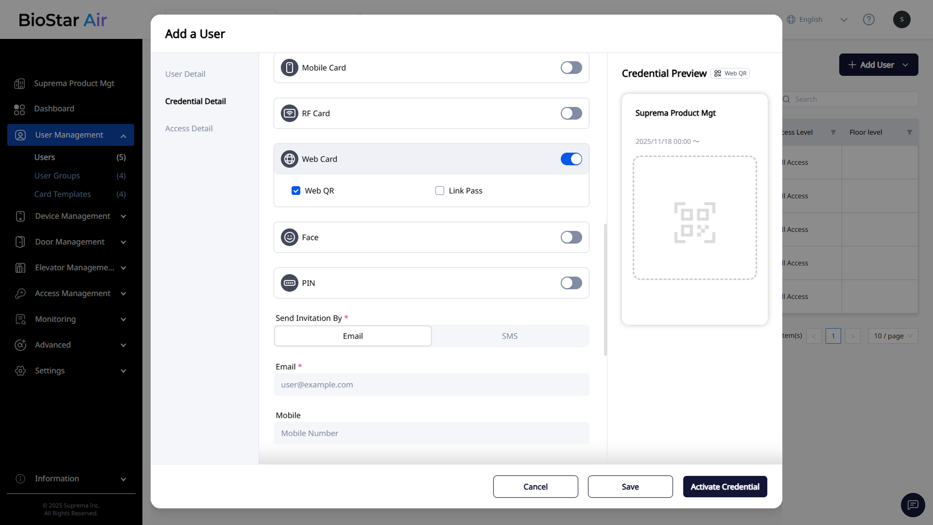 Email the Suprema Pass app download link to users who use Mobile Card or Web Card. Enter the email address (required) and phone number (optional).