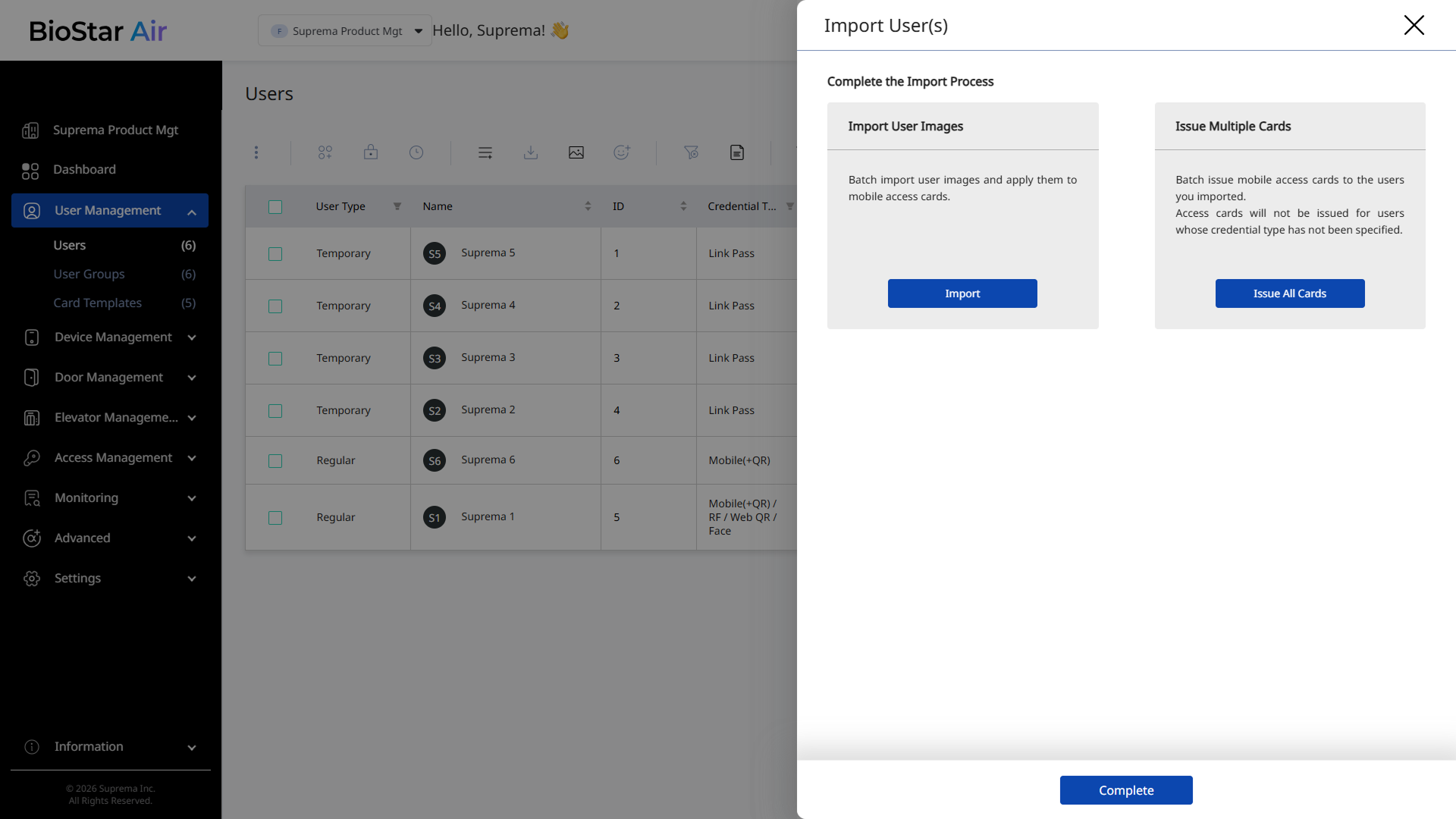 After the upload completes, you can import user images or issue mobile cards in bulk on the next screen. Select the desired action.
