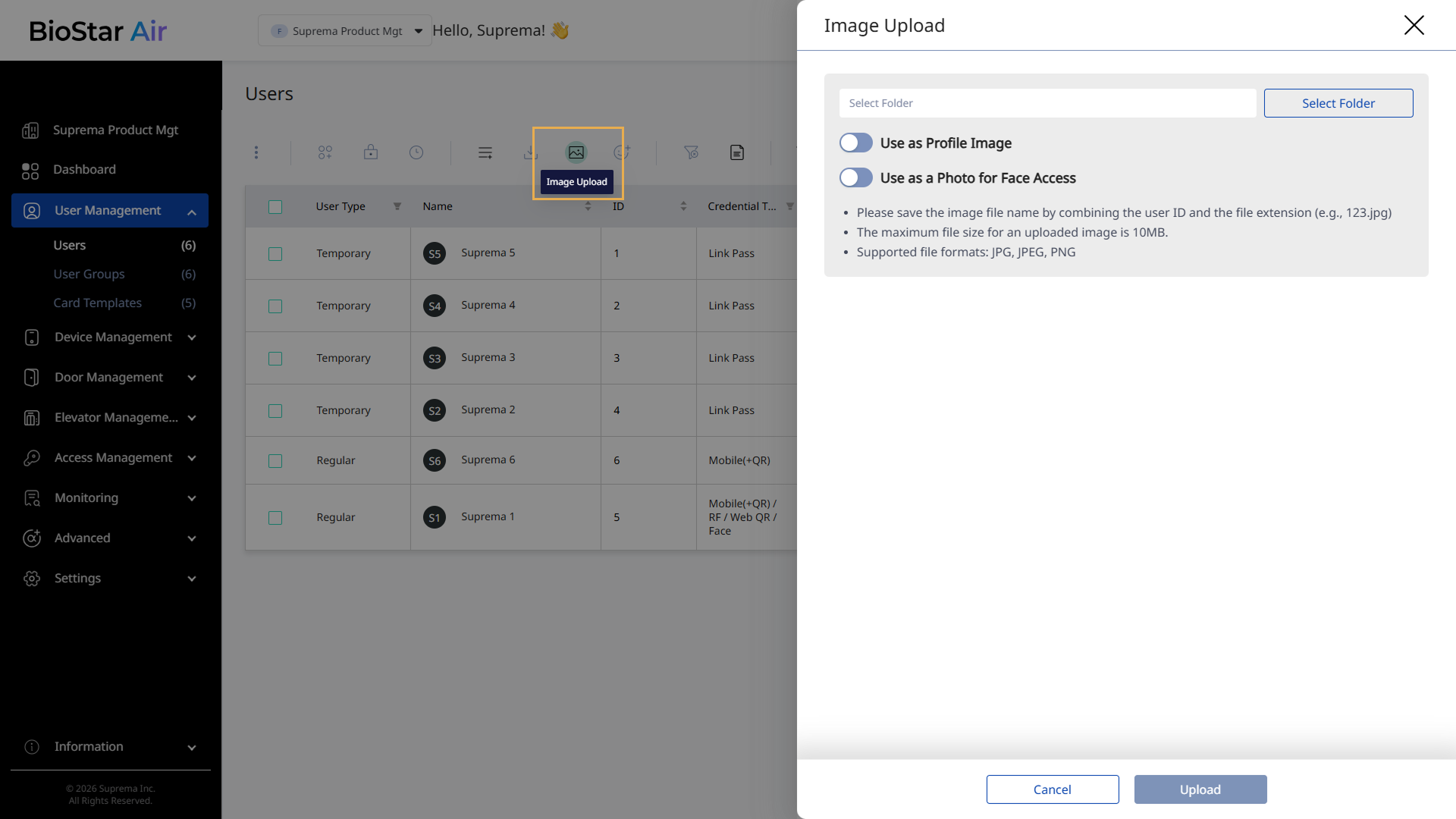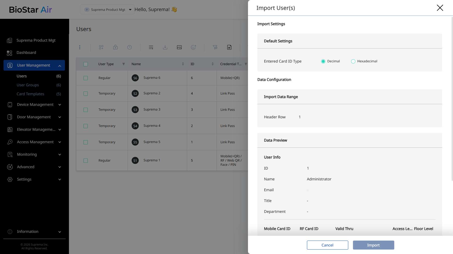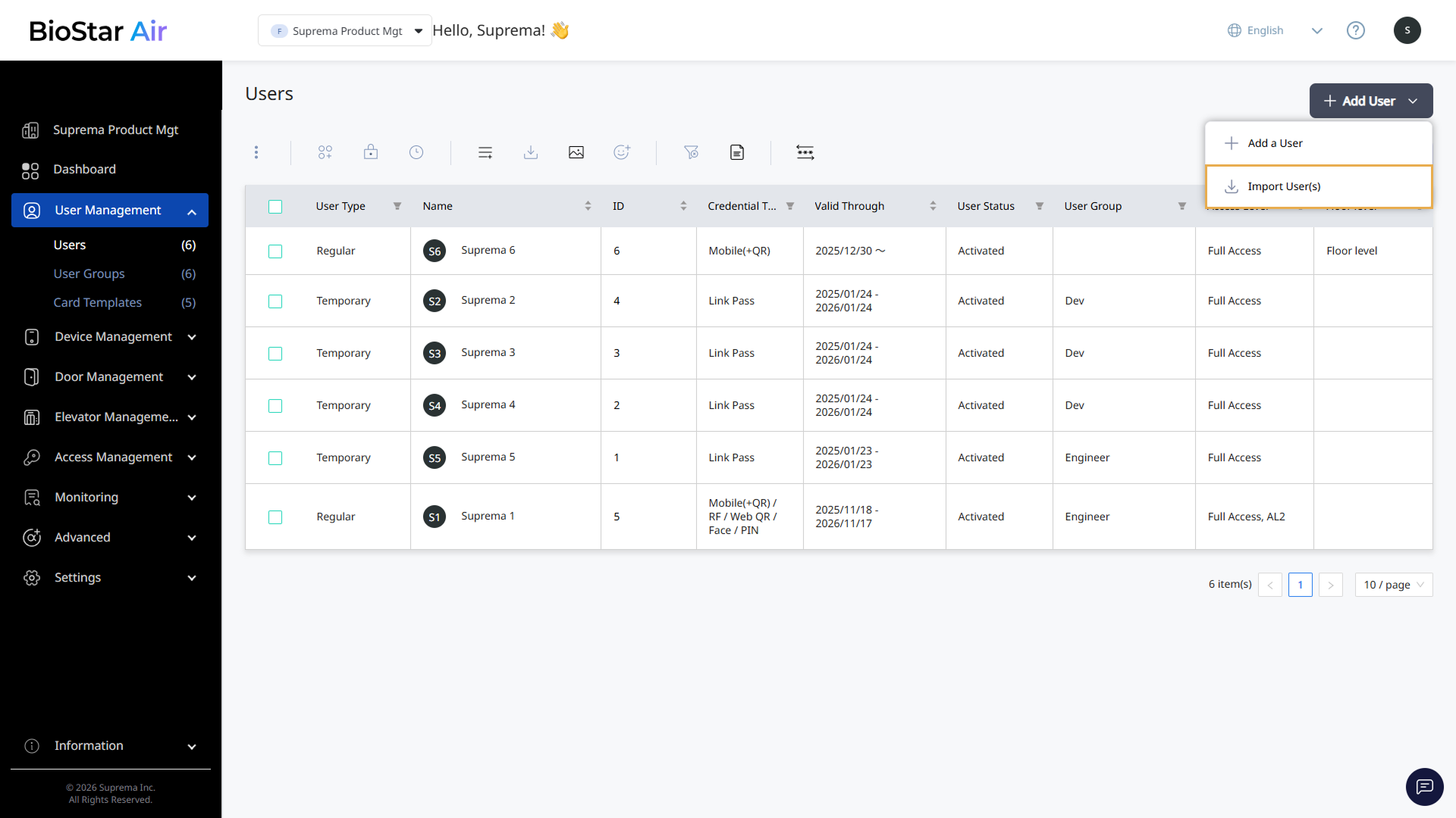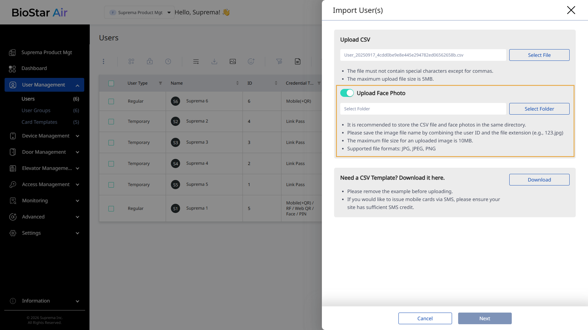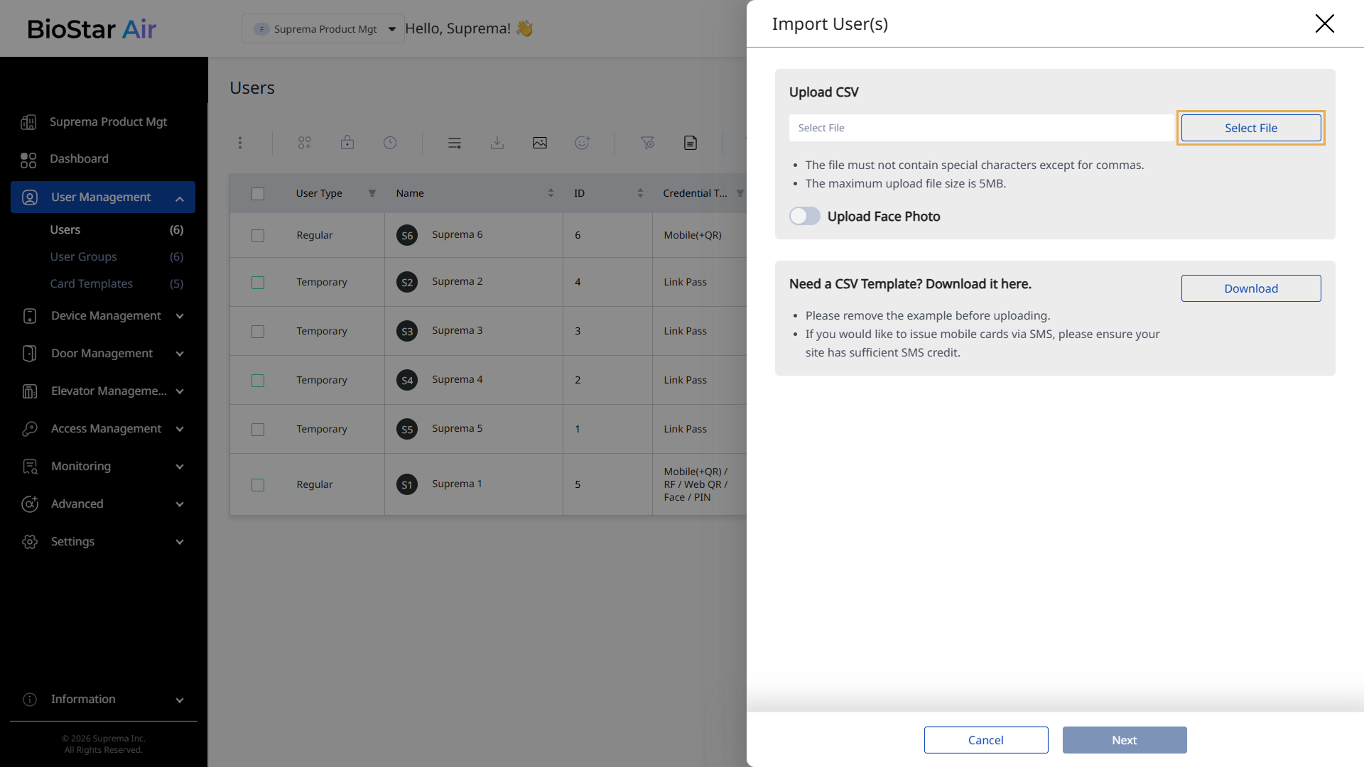 With BioStar Air, administrators can add multiple users at once using a CSV file. This feature is useful for efficiently handling employee onboarding, site upgrades, or temporary access requirements.