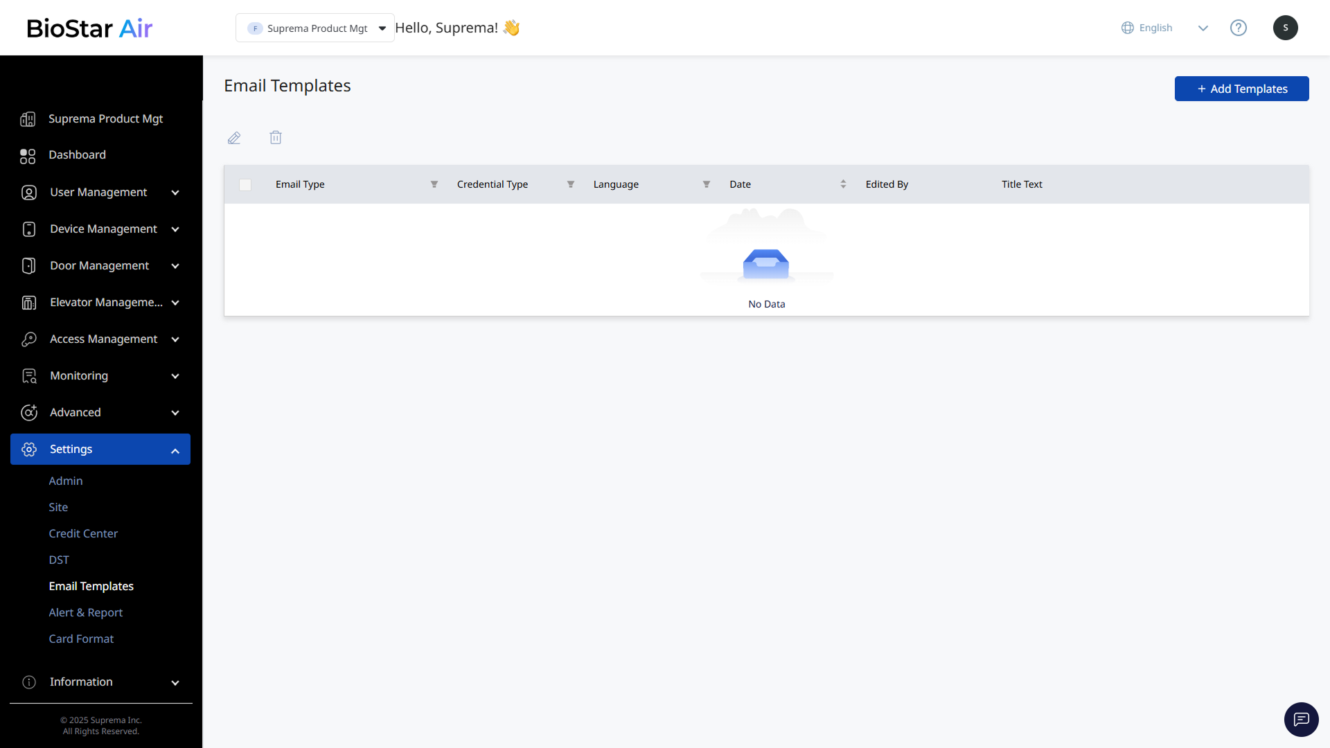 With BioStar Air's email template feature, customize the emails sent to site users to reflect your company's branding and message. Email templates include invitations, activation emails, and other notifications.