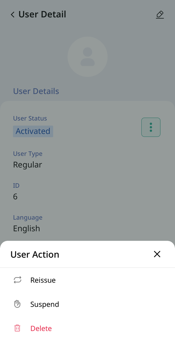 Tap a user in the user list. In the User Detail screen, tap . The User actions menu appears.