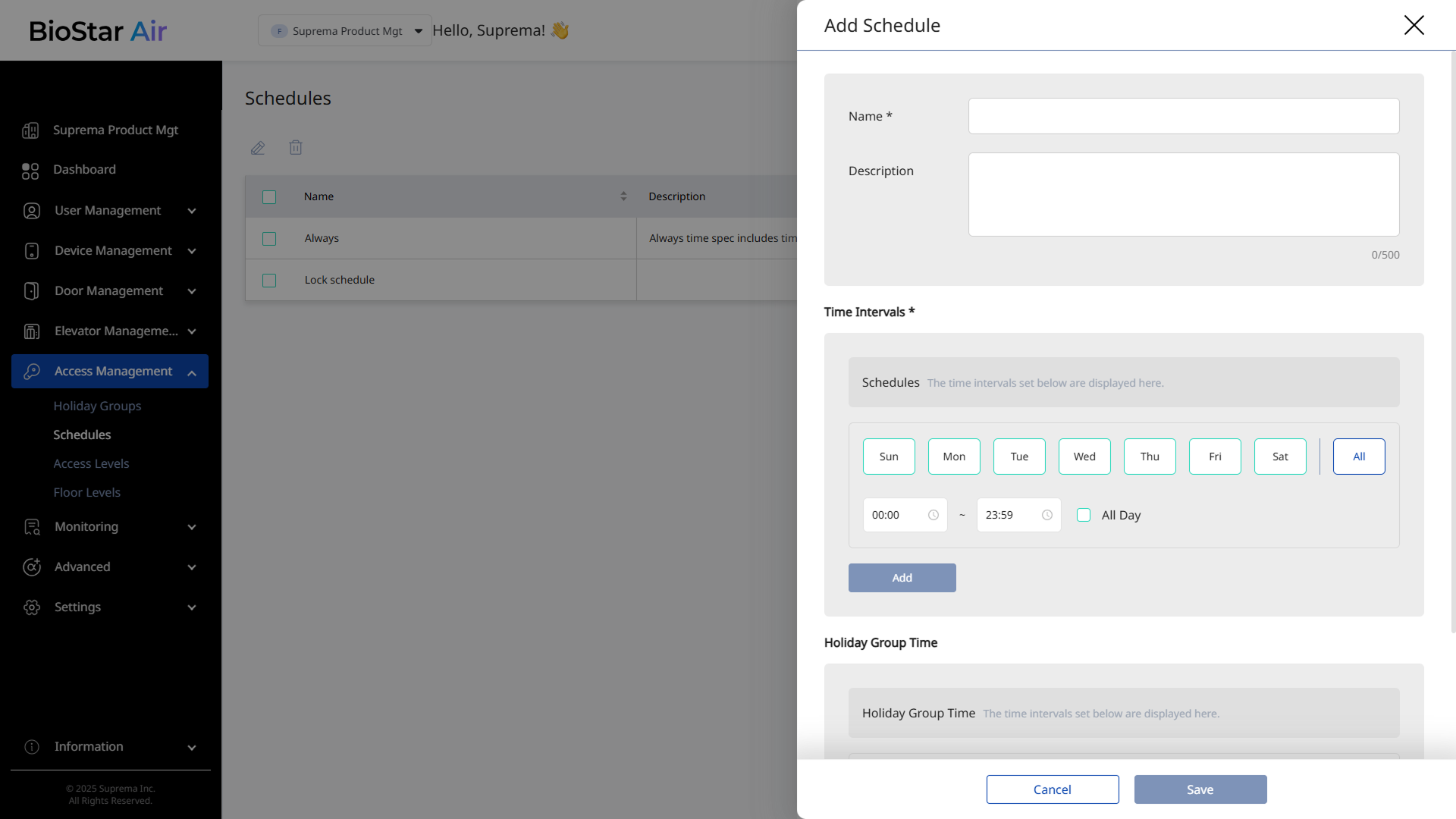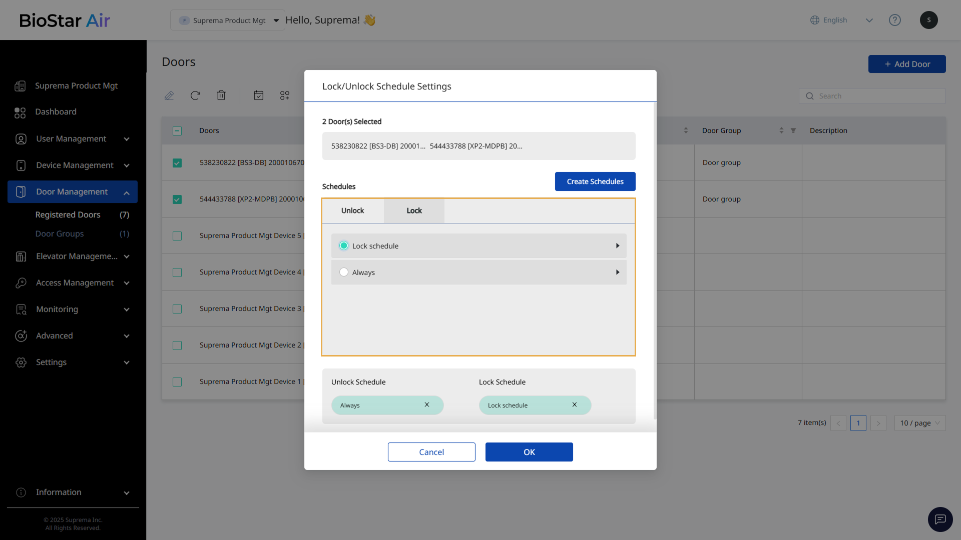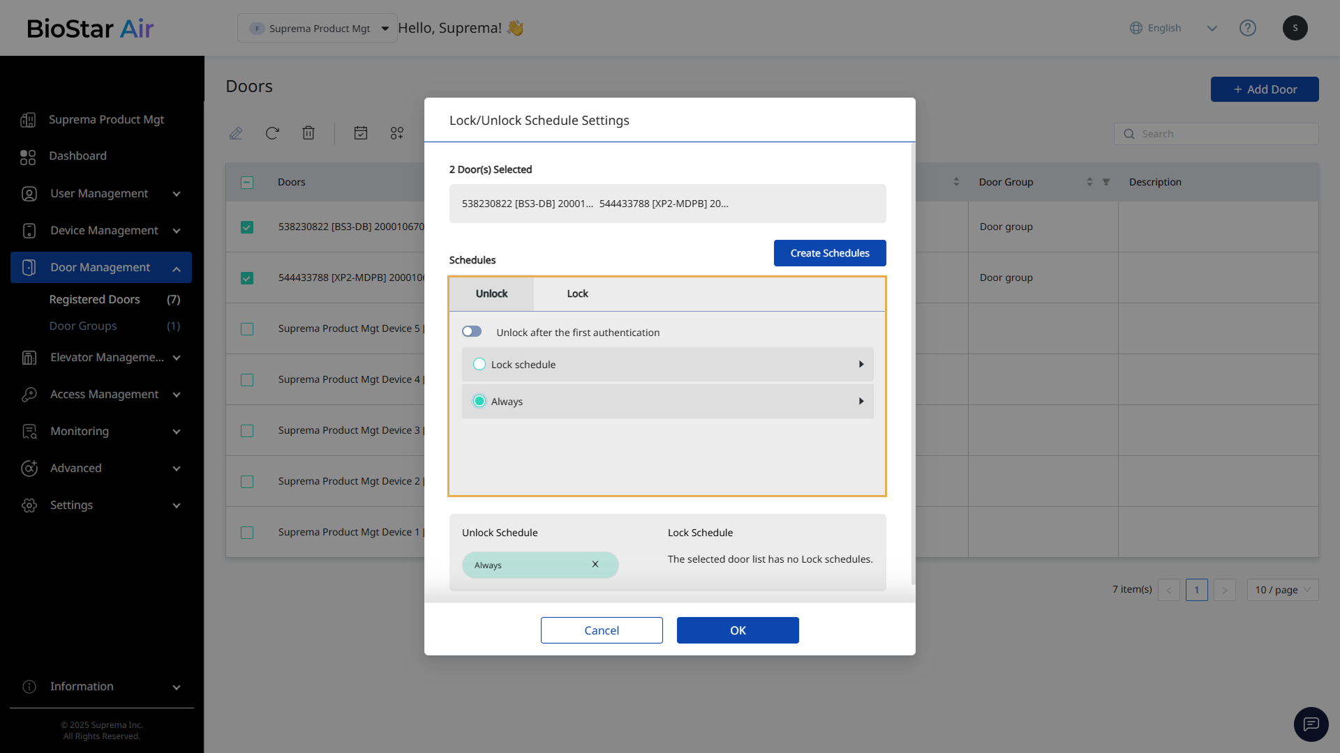 With door schedules in BioStar Air, administrators can automate door locking and unlocking based on time settings. Schedule settings help ensure safe, controlled access. Administrators can set lock and unlock schedules and configure advanced options such as Unlock after the first authentication.