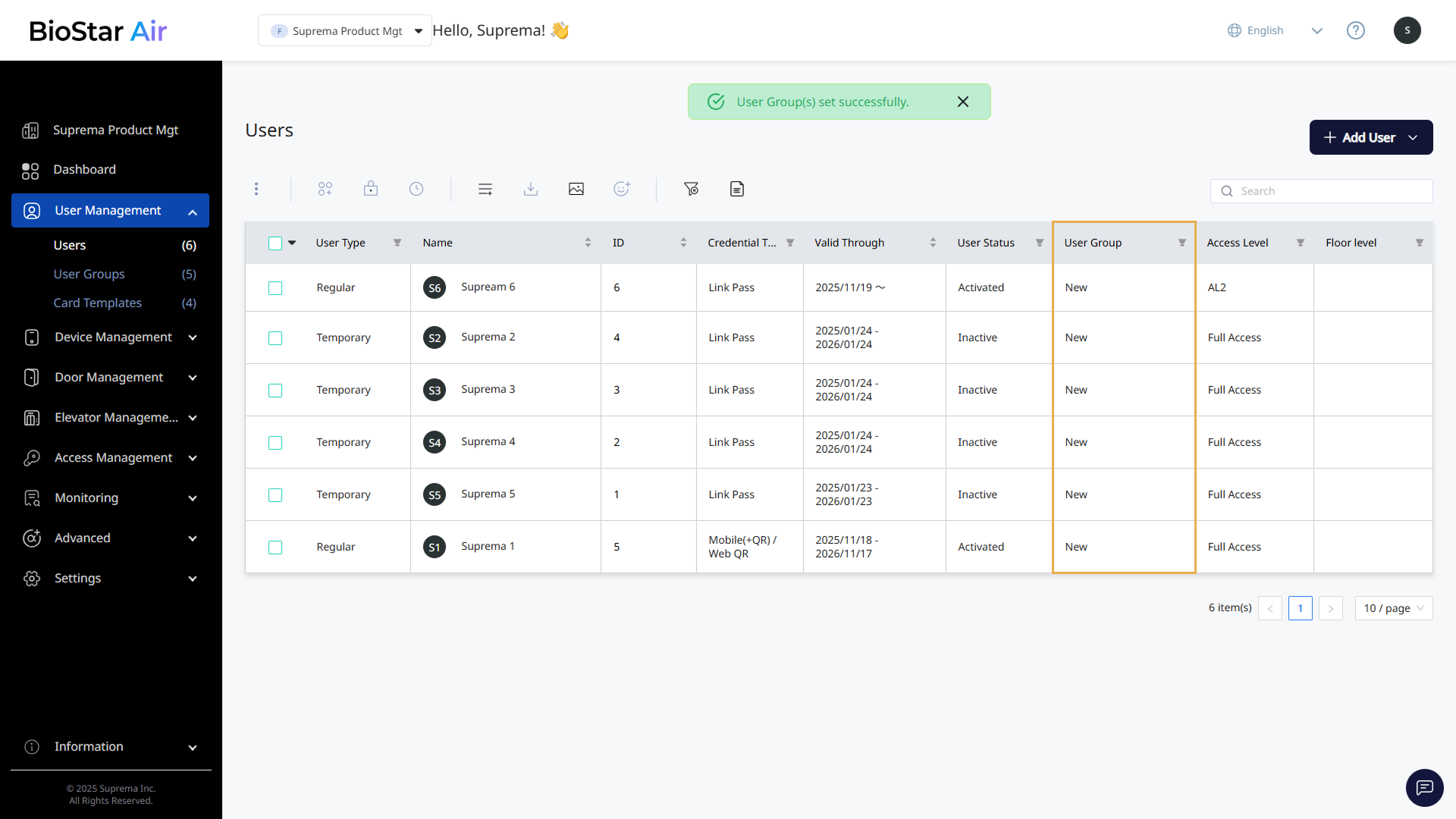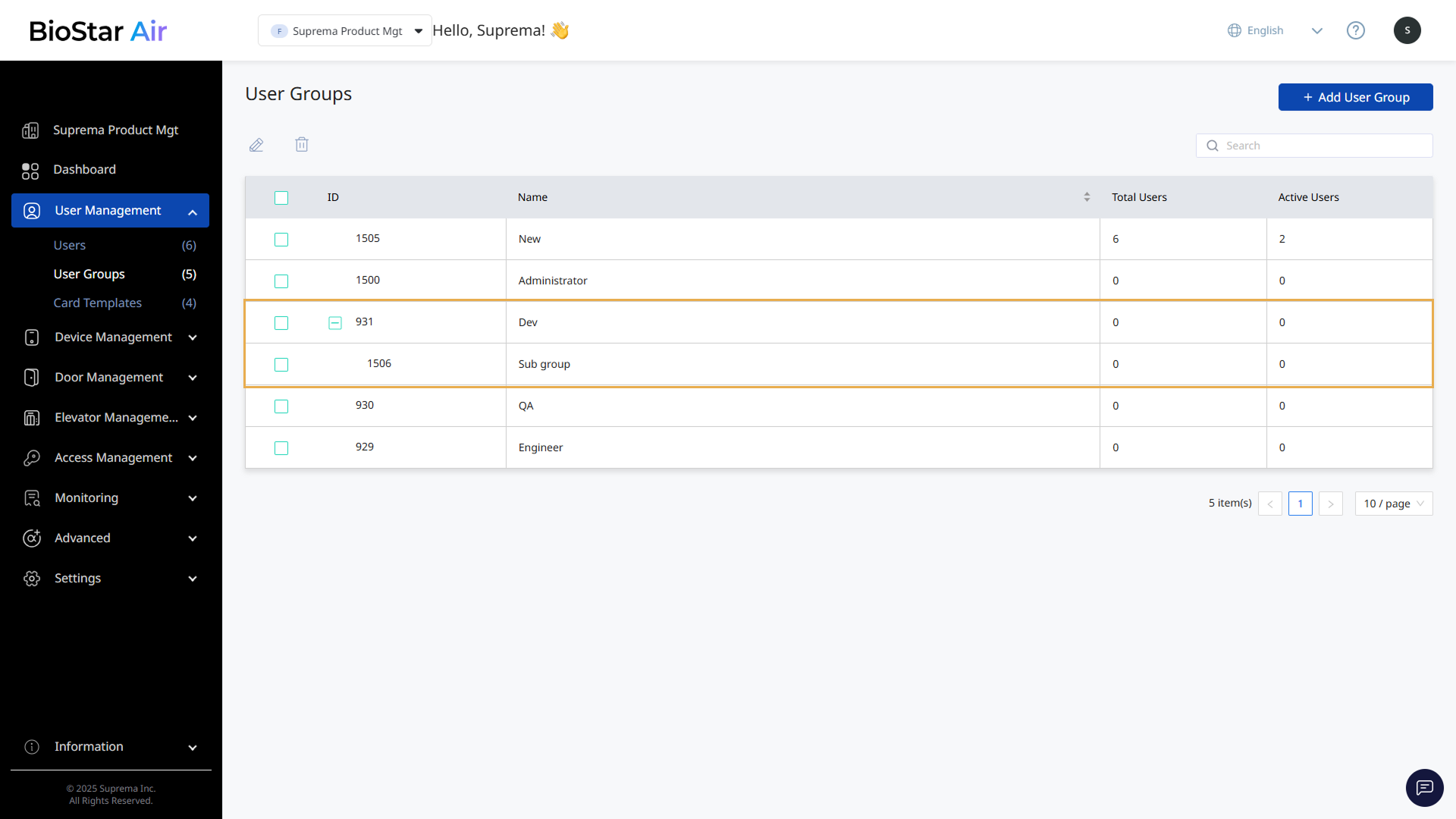 In BioStar Air, administrators can categorize users by department, role, or other criteria through user groups. This enables more efficient configuration and management of access control.