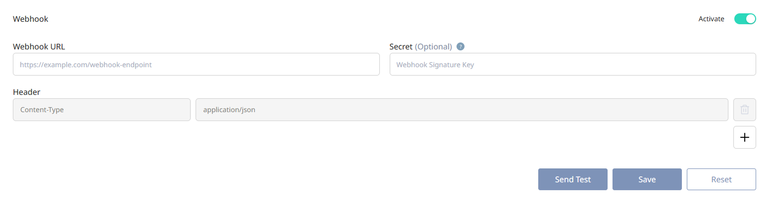 Webhook URL: Enter the endpoint address of the external server that will receive events. Example: