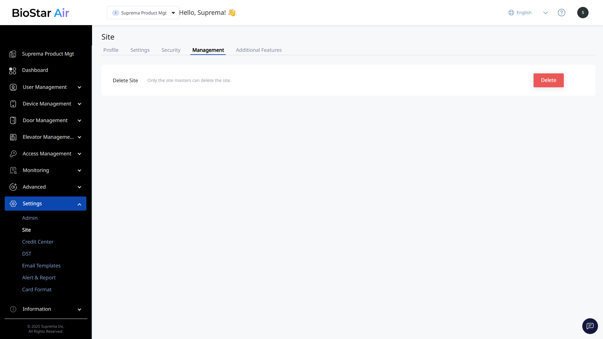 Click Settings → Site in the left sidebar. The only option available in the Management tab is Delete Site. This action is irreversible, and only the master administrator can delete a site.