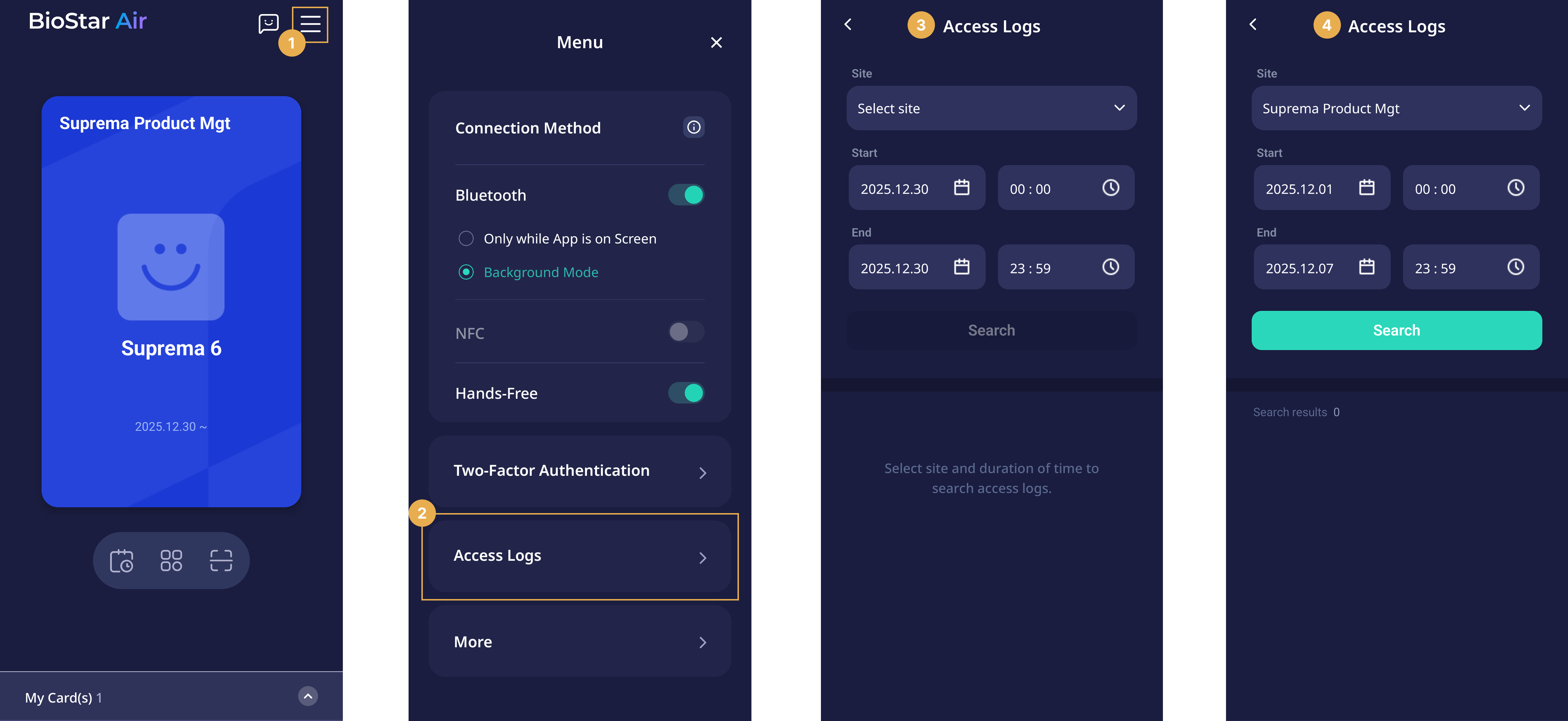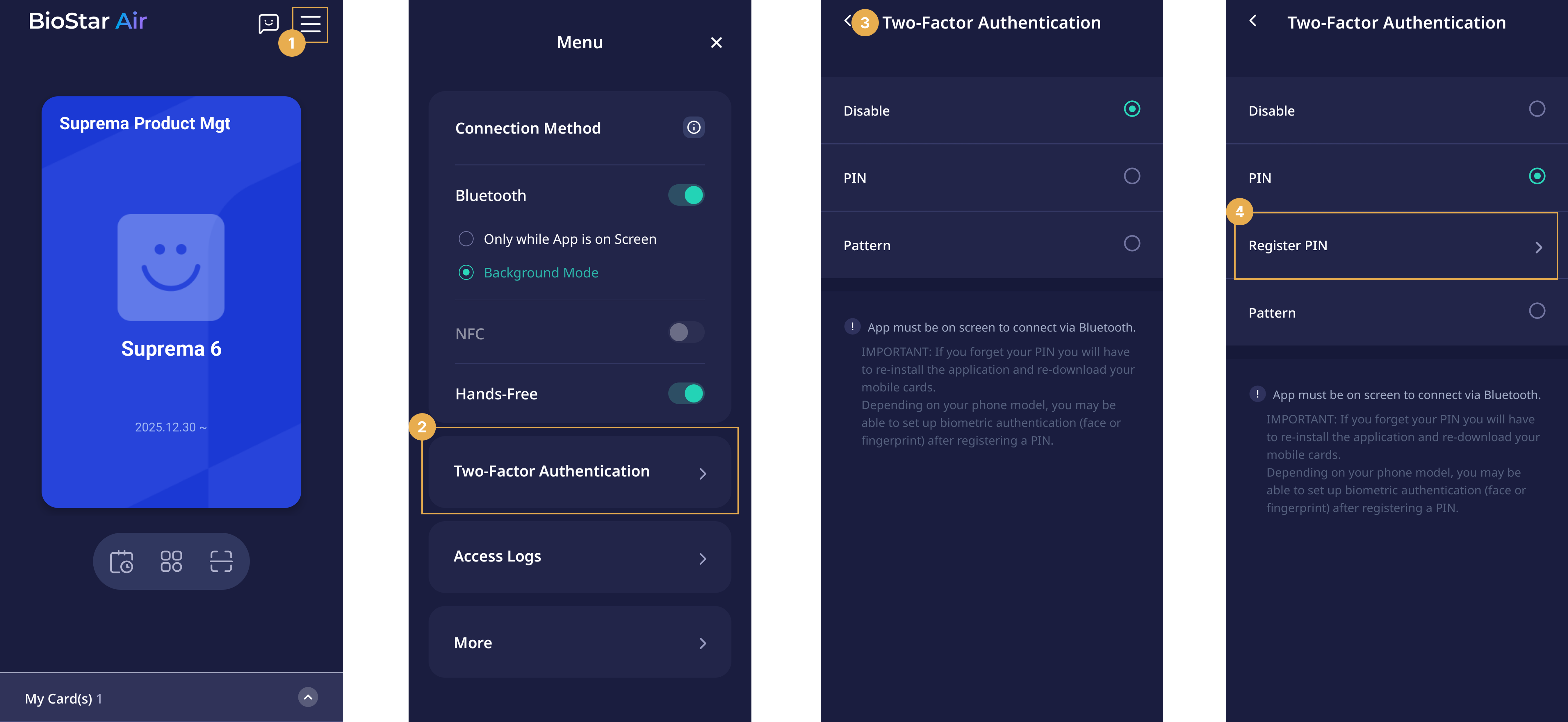 The Suprema Pass app includes advanced settings and security options to enhance the user experience and access control features. Users can configure authentication methods, enable two-factor authentication, review access logs, report issues, and use support features.