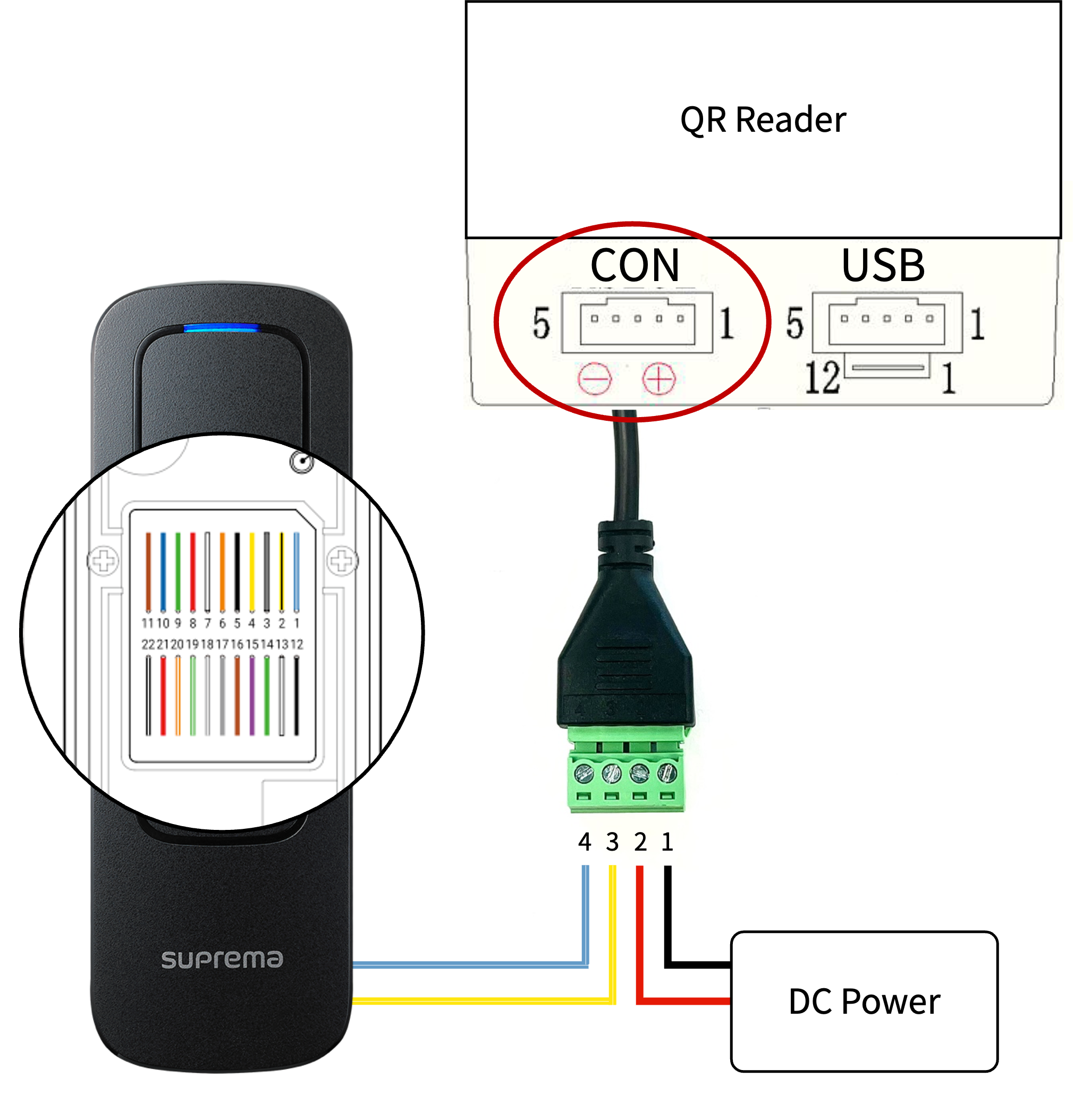 Connect the white 4-pin pin-and-socket connector to the CONport on the bottom of the QR scanner. This connector is polarized (with a groove), so it only fits in one direction.