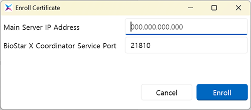 Enroll Certificate 창이 나타나면 Server Address 입력 필드에 변경한 메인 서버의 IP 주소 및 포트 번호(기본값: 21810)를 입력하세요.