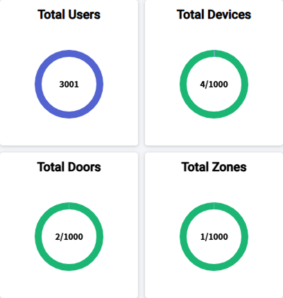 - Total Users, Total Cards, Total Fingerprints, Total Faces, Total Faces, Total QR/Barcode, Total Mobile Access, Total Devices, Total Doors, Total Advanced ACs, Total Access Groups, Total User Groups, Total Device Groups