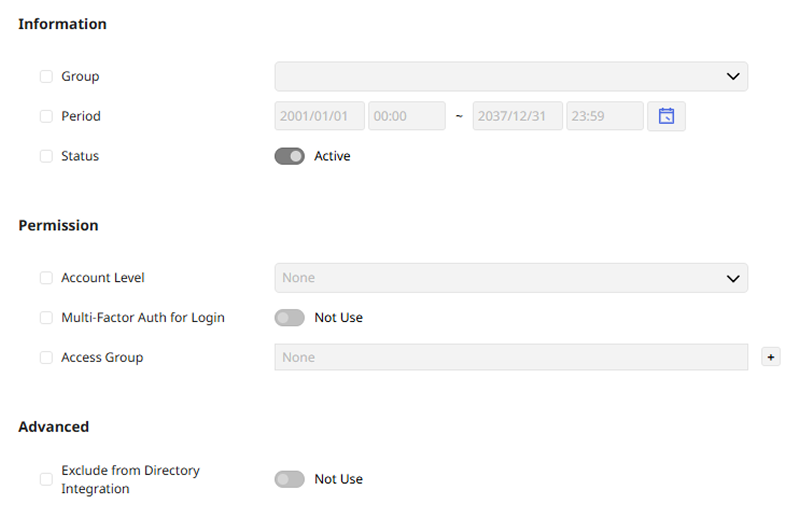 You can edit the information or access permissions of multiple users at once. This feature is useful when setting the same access permissions or groups for multiple users.