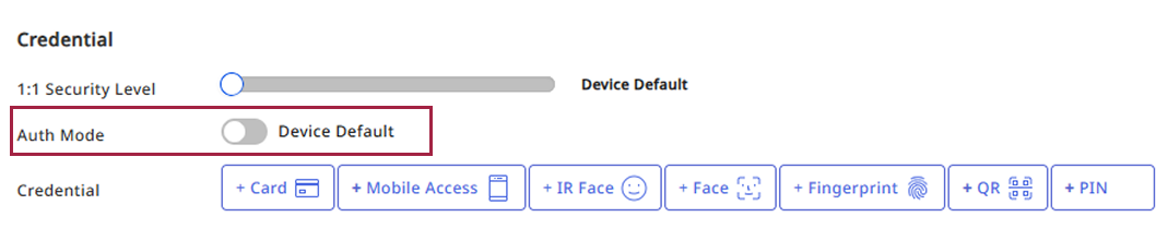 Setting Include Device Default Authentication Mode allows the use of both the authentication modes set on the device and the private authentication modes configured in BioStar X.