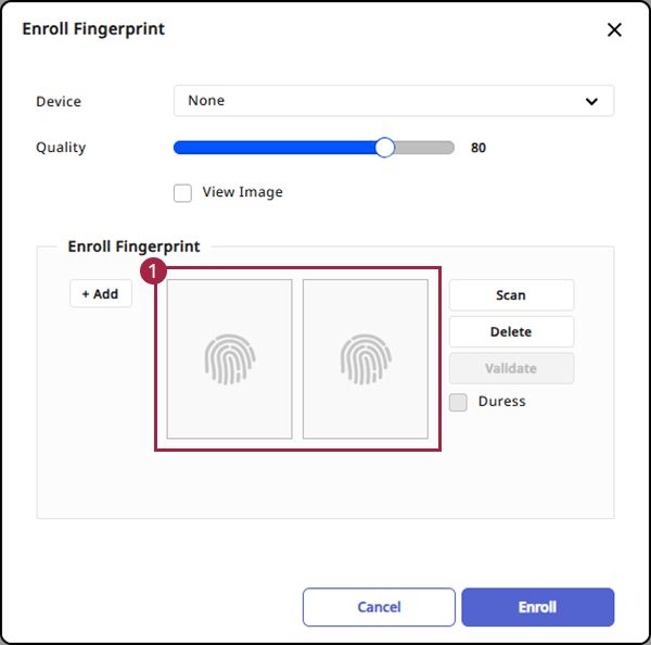 In the Credential section, click the + Fingerprint button. When the Enroll Fingerprint window appears, configure each item and click the Enroll button.