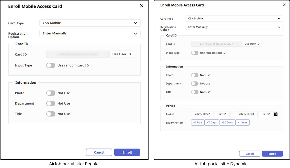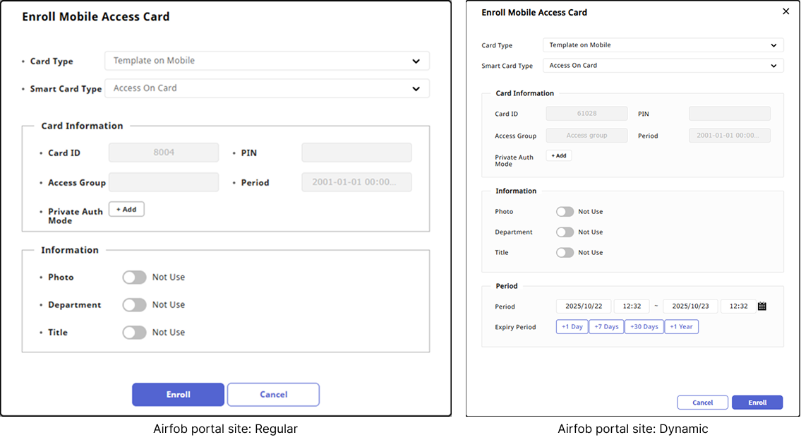 The Period item is activated when setting a Dynamic site upon site creation in the AirPop portal. You can set the expiration duration and usage period for the mobile access cards. For more information about the Airfob Portal, refer to the following link.