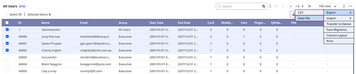 User information can be stored on external storage (USB) for import into BioStar X or devices. Up to 500,000 user records can be transferred from the server to devices or between devices.