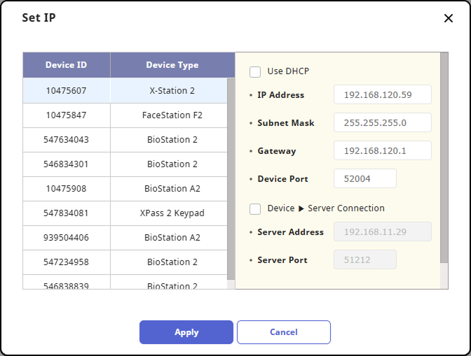 Device ▶ Server Connection: Select this option to configure the device to connect to the BioStar X server. You will need to enter the IP address and port number of the server where BioStar X is installed.