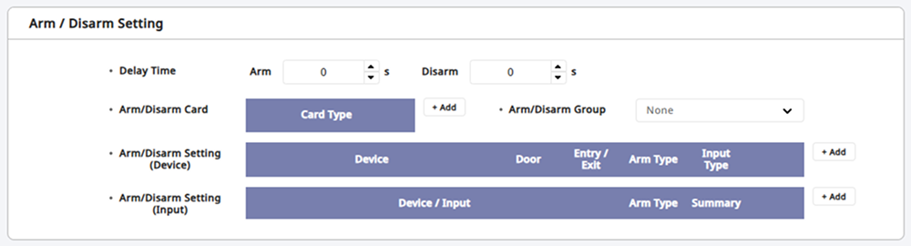 Set the arming/disarming by the device or input signal with Arm/Disarm Setting. Click the + Add button and configure each item.