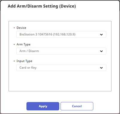 Click the + Add button in the Arm/Disarm Setting (Device) option. Select the device to control the intrusion alarm feature and choose Arm Type.