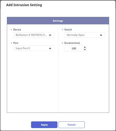 You can set up the intrusion detection signals. Click + Add and set it as shown below to recognize an intrusion when an N/O sensor connected to input port 0 of the BioStation 3 device sends a signal for 100(ms).