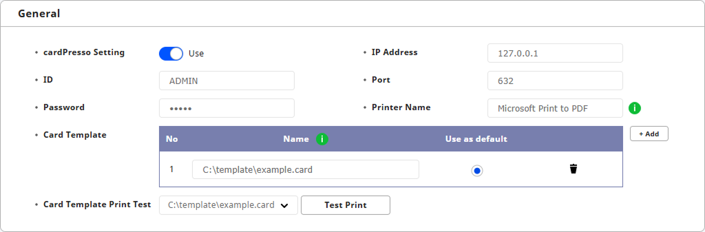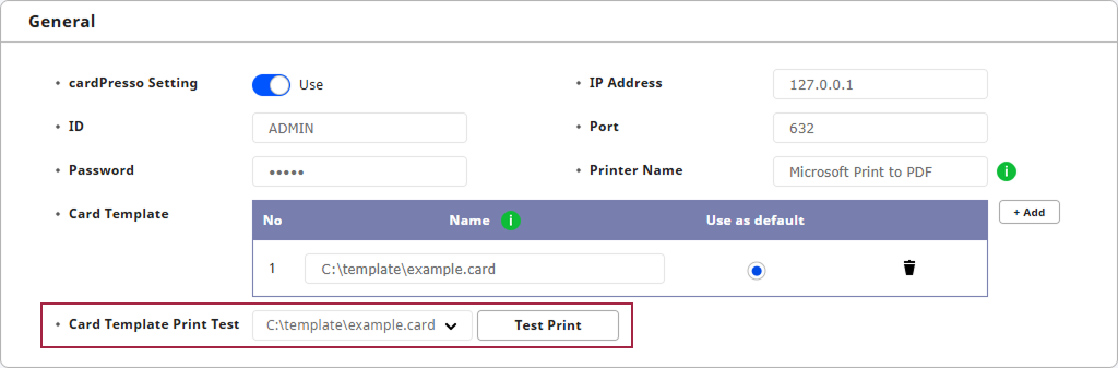 ID: Enter your cardPresso login ID. (default: ADMIN)