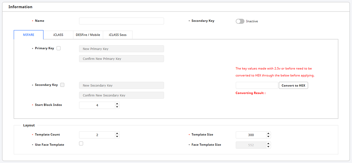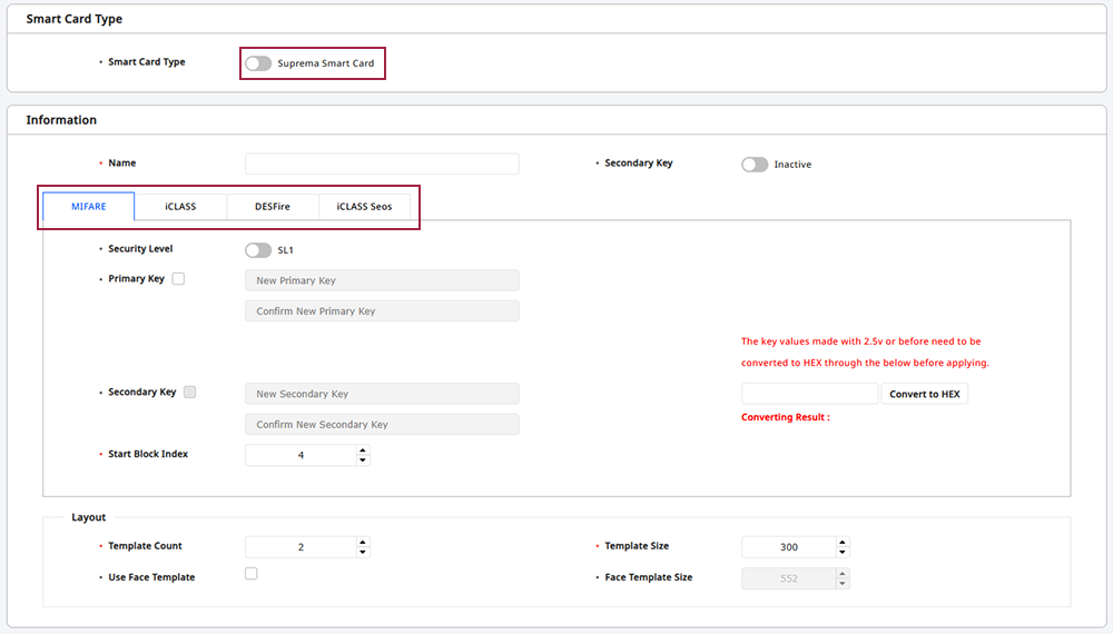Convert to HEX is only available when the Smart Card Type option is Suprema Smart Card.