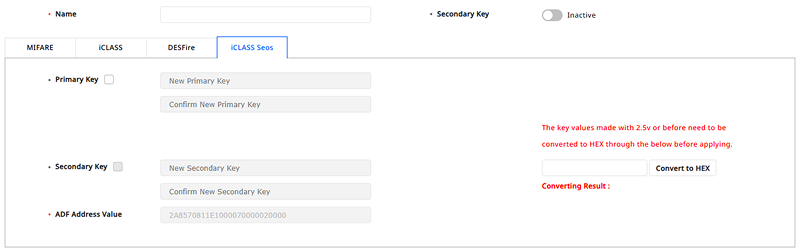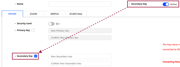 Secondary Key: Used for authentication when the card's primary site key does not match. The secondary site key can only be entered after activating the Secondary Key option at the top of the section.