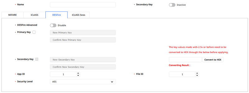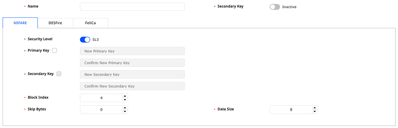 Secondary Key: Configure whether to use a secondary site key. Set to Active to enable secondary site key configuration. When a secondary site key is set, it will be used for authentication when the card's primary site key does not match.