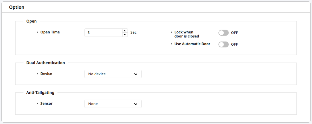 Use Automatic Door: If using an automatic door as the door, the relay can operate regardless of the door sensor's status. If set to On, the Lock when door is closed option cannot be used.
