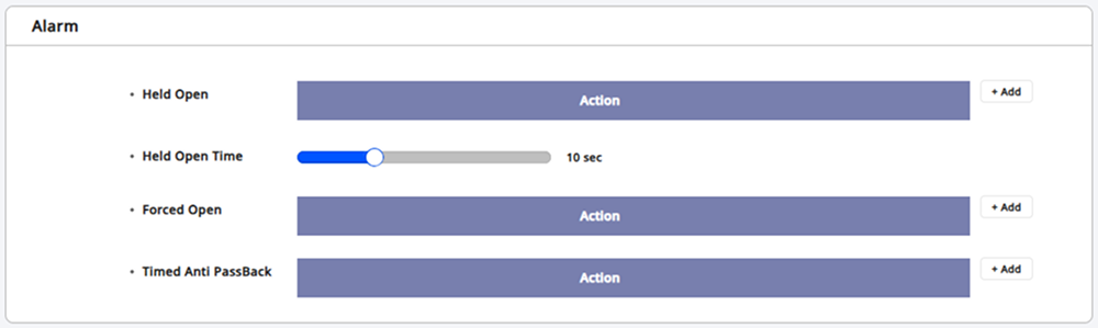In the Alarm section, you can configure to sound an alarm or block device usage when the door is forcibly opened, left open, or when an anti-passback violation occurs. Click the + Add button for the item to add an alarm.