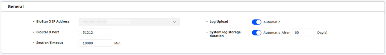 General: You can set the IP address, port number, session expiration time, event log upload method, and log retention period.