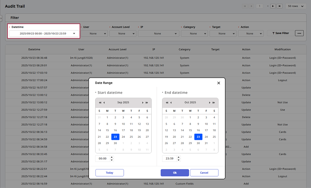 The Audit Trail feature records and tracks all activities occurring in the system. All activities such as user login/logout, setting changes, and system administration tasks are recorded and can be utilized for security audits and system monitoring.