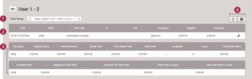 Click in/out times to add/modify/delete attendance records. After clicking the in/out times, click the button to modify the registered attendance record, and click the Apply button to save changes.