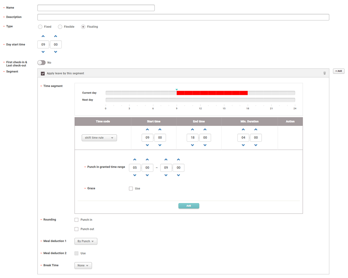 This is a work rule that allows flexible setting of arrival and departure times. Enter the name and description of Shift and select Type as Floating.