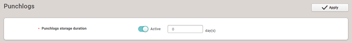 You can set the period to store attendance records. Set the Punchlogs storage duration option to Active and enter the period. To save the settings, click Apply.