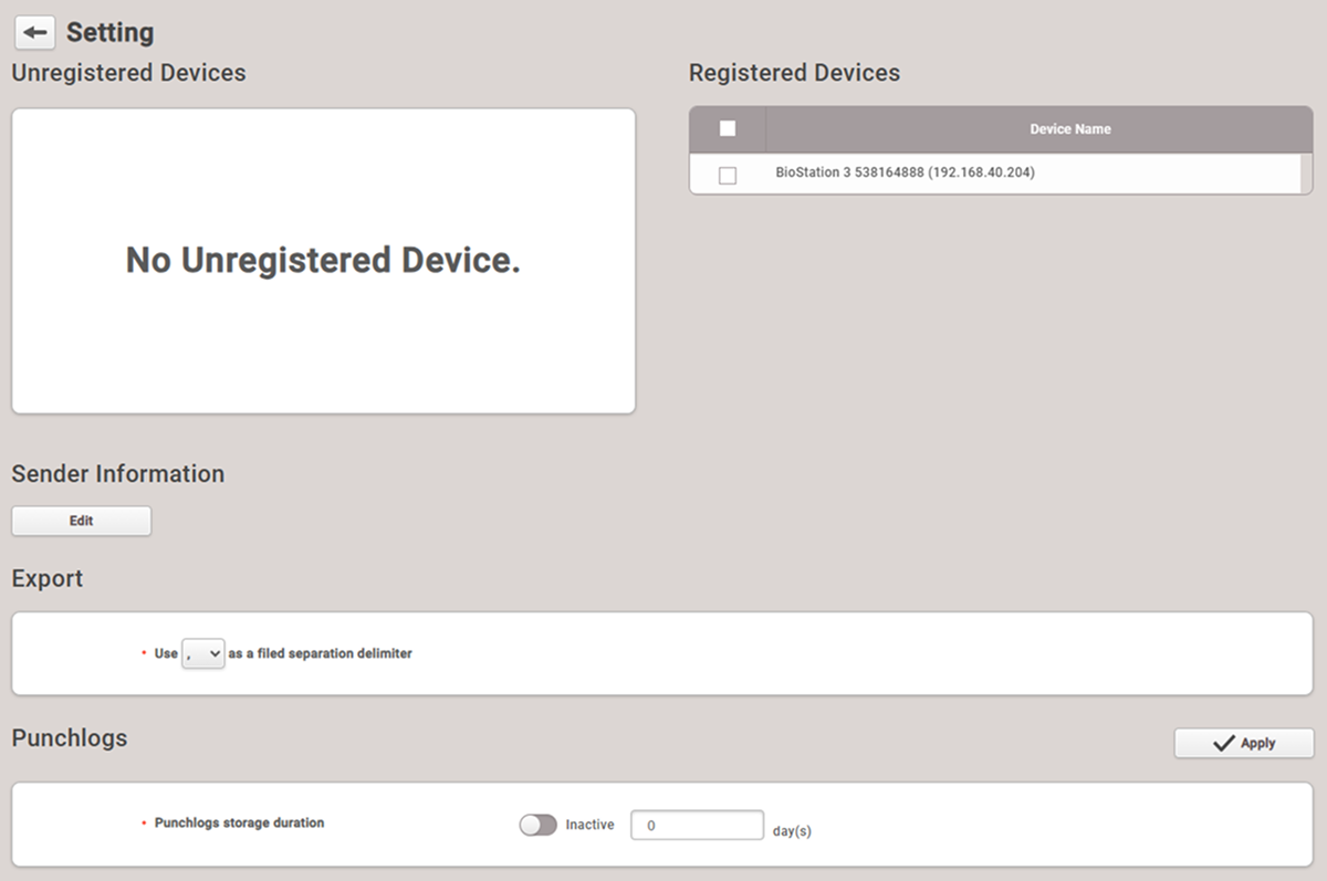 To edit the attendance settings of a registered device, click Setting. For more information on attendance settings, refer to the following link.