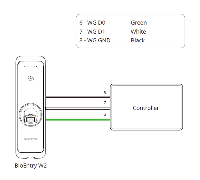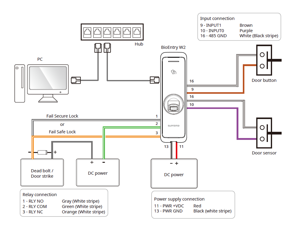 Los lectores inteligentes independientes de Suprema contienen relés internos que pueden bloquear/desbloquear puertas directamente sin controladores externos para mayor comodidad. Sin embargo, para aplicaciones de control de acceso que requieren seguridad, NO se recomienda utilizar el relé interno de un lector a fin de evitar manipulaciones que puedan desbloquear la puerta. Para estas aplicaciones, se recomienda encarecidamente usar una unidad de relé independiente para el control de la cerradura, como Secure I/O 2, DM-20 o CoreStation de Suprema, instaladas en el lado seguro de la puerta.