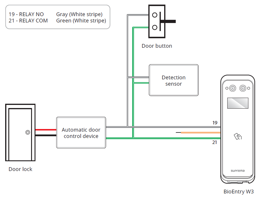Para utilizar la cerradura Fail Secure, conecte el relé N/O como se muestra en la figura a continuación. Normalmente no circula corriente a través del relé de la cerradura Fail Secure. Cuando el relé active el flujo de corriente, la puerta se abrirá. Si se corta la alimentación del producto debido a un fallo de energía o a un factor externo, la puerta se bloqueará.