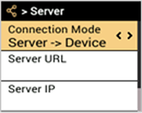 Connection Mode: Al seleccionar Device → Server se envía una señal de conexión directa al servidor con la información ingresada en el dispositivo. Se pueden ingresar Server URL, Server IP y Server Port.