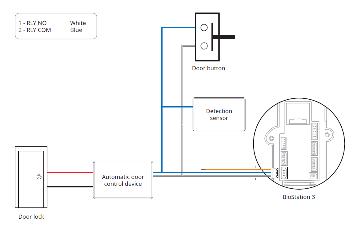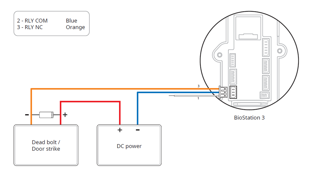 Los lectores inteligentes independientes de Suprema contienen relés internos que pueden bloquear/desbloquear puertas directamente sin controladores externos para mayor comodidad. Sin embargo, para aplicaciones de control de acceso que requieren seguridad, NO se recomienda utilizar el relé interno de un lector a fin de evitar manipulaciones que puedan desbloquear la puerta. Para estas aplicaciones, se recomienda encarecidamente usar una unidad de relé independiente para el control de la cerradura, como Secure I/O 2, DM-20 o CoreStation de Suprema, instaladas en el lado seguro de la puerta.