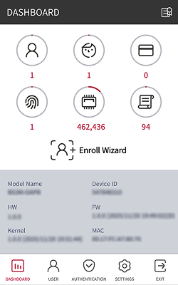 DASHBOARD에서 장치 사용 현황 및 정보를 확인할 수 있습니다. 또는 Enroll Wizard를 눌러 바로 사용자를 등록할 수도 있습니다.