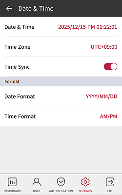 Date & Time: 현재 날짜와 시간을 확인할 수 있습니다. 직접 수정하려면 Time Sync를 끄세요.