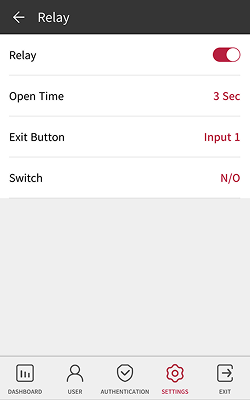 Relay: 릴레이 활성화 여부를 설정할 수 있습니다. 릴레이 설정을 켜면 Open Time, Exit Button을 설정할 수 있습니다.