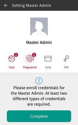 원하는 인증 수단을 설정한 후 저장하려면 Complete를 누르세요.