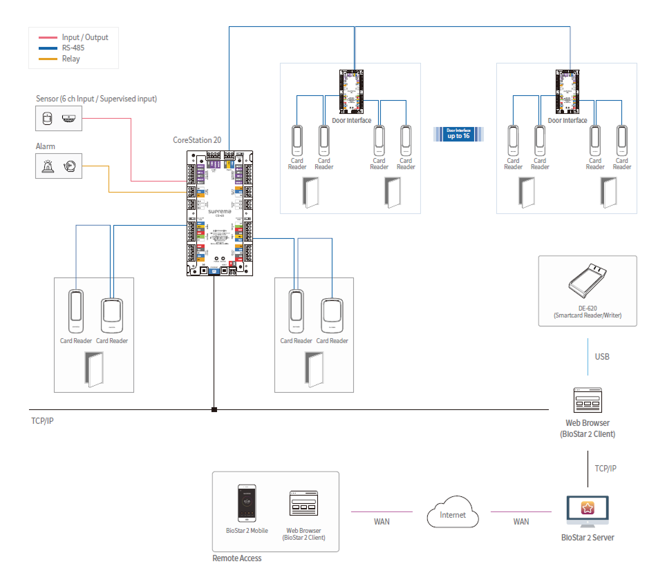 Si conecta la Door Interface como esclava al puerto host, incluso si se interrumpe la conexión con CoreStation 20, los dispositivos esclavos conectados a la Door Interface pueden identificar el Facility Code de la tarjeta mediante el modo sin conexión dedicado al Facility Code y desbloquear la puerta.