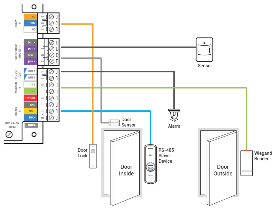 Conecte hasta 64 dispositivos RS-485 y conecte en serie un Módulo de Puerta para admitir hasta 132 dispositivos Wiegand.