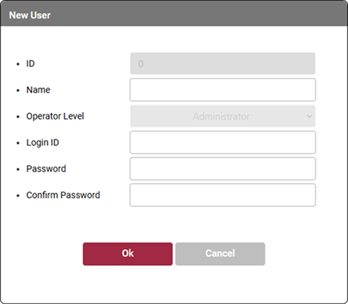 - Se puede ingresar un nombre de hasta 48 caracteres.Operator Level El Operator Level se establece automáticamente en Administrator y no puede cambiarse. Login ID Ingrese el Login ID.