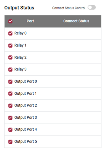 Se muestra el estado de conexión de los puertos de relé y de salida. Seleccione el elemento deseado y haga clic en el interruptor para controlar los puertos de relé y de salida.