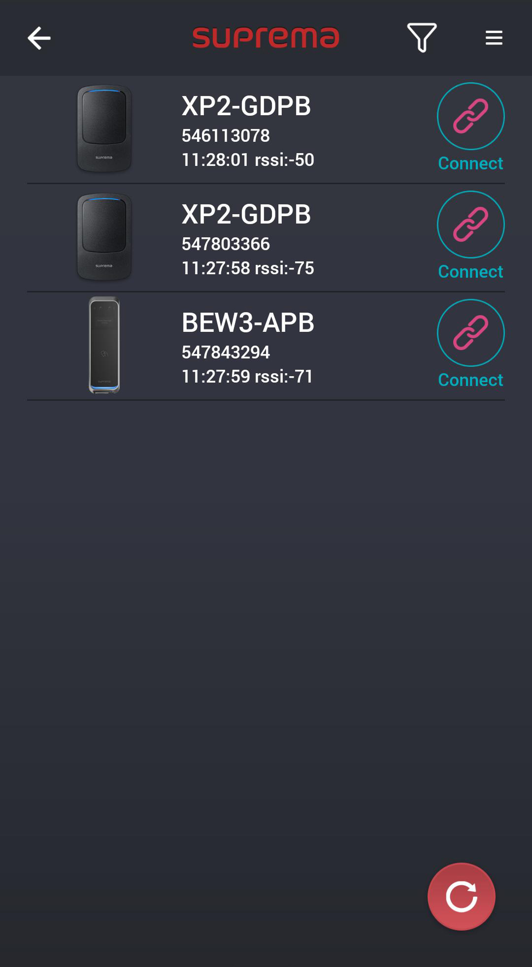 Device Filter: En la parte superior de la pantalla de lista de dispositivos, presione para mostrar solo los dispositivos deseados en la lista.
