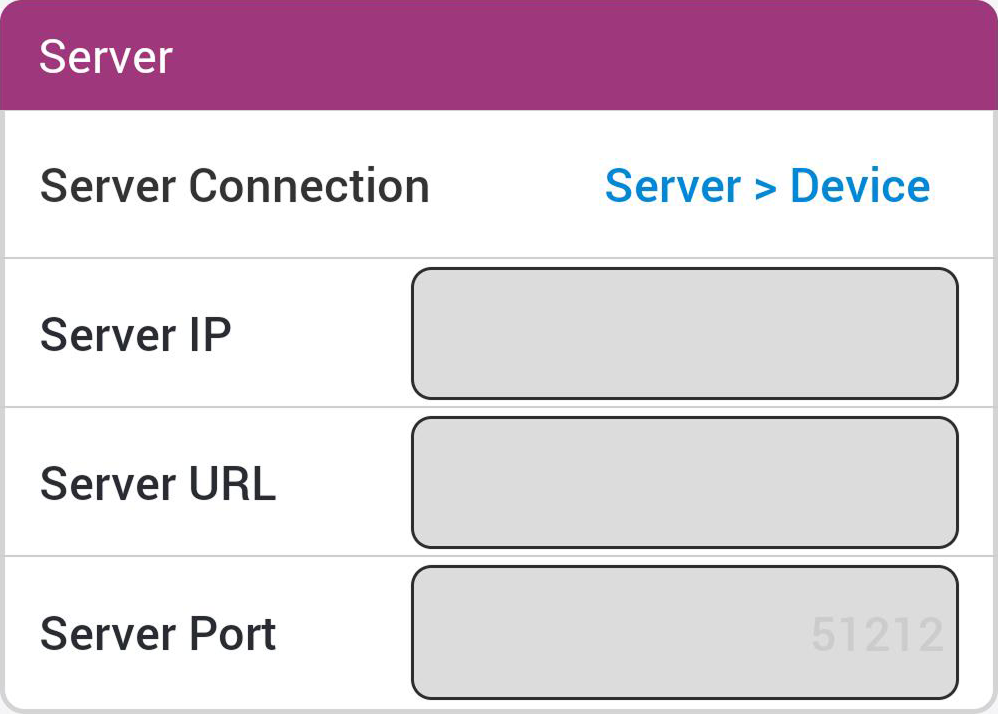 Server Connection: Configure el método de comunicación del servidor. Para buscar y conectar el dispositivo desde el servidor, seleccione Server > Device. Para establecer la información del servidor para conectar el dispositivo, seleccione Device > Server.